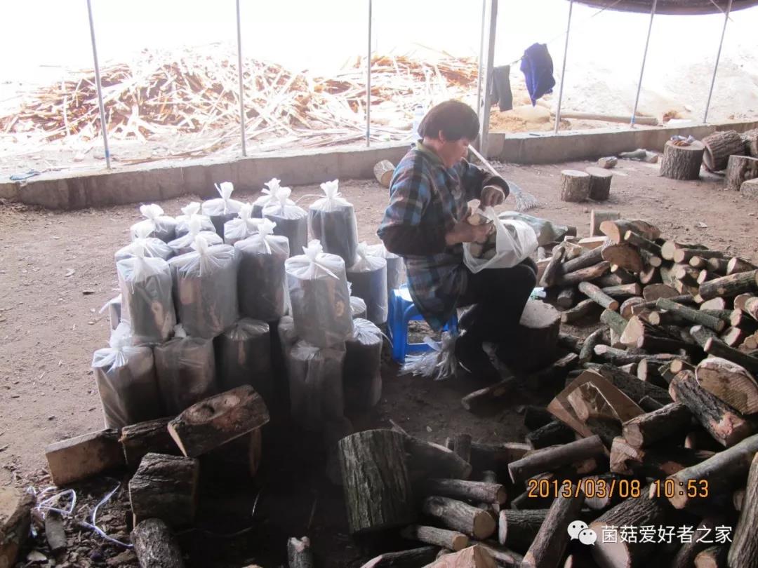 4、將木段裝進(jìn)塑料袋,然后滅菌,殺死袋子里的一切微生物,隨后將菌種接入到塑料袋里段木的兩頭,讓靈芝菌種從兩頭向中間生長(zhǎng)。