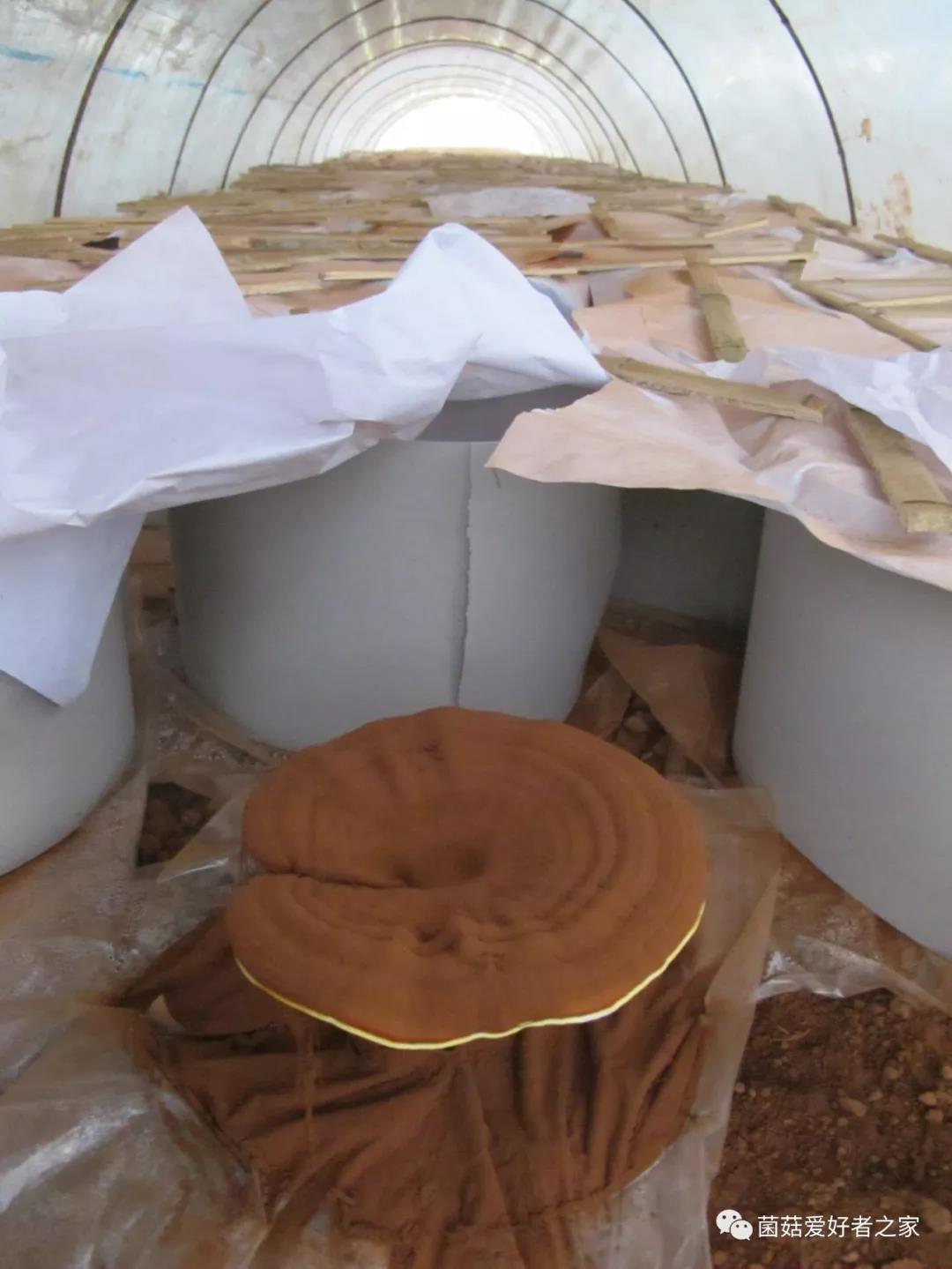 12、當(dāng)芝蓋有少量孢子彈射釋放時(shí),給靈芝套上直徑18-20厘米的圓筒。套筒前,噴水、抹平、壓實(shí)地面,平鋪2-3層寬度比套筒周邊大2-3厘米的接粉薄膜,便于取粉。逐個(gè)用套筒將靈芝套住,下與接粉薄膜相連,上面蓋上白色卡紙,并用2-3個(gè)竹片壓實(shí),使套筒在封閉條件下接受彈射孢子。
